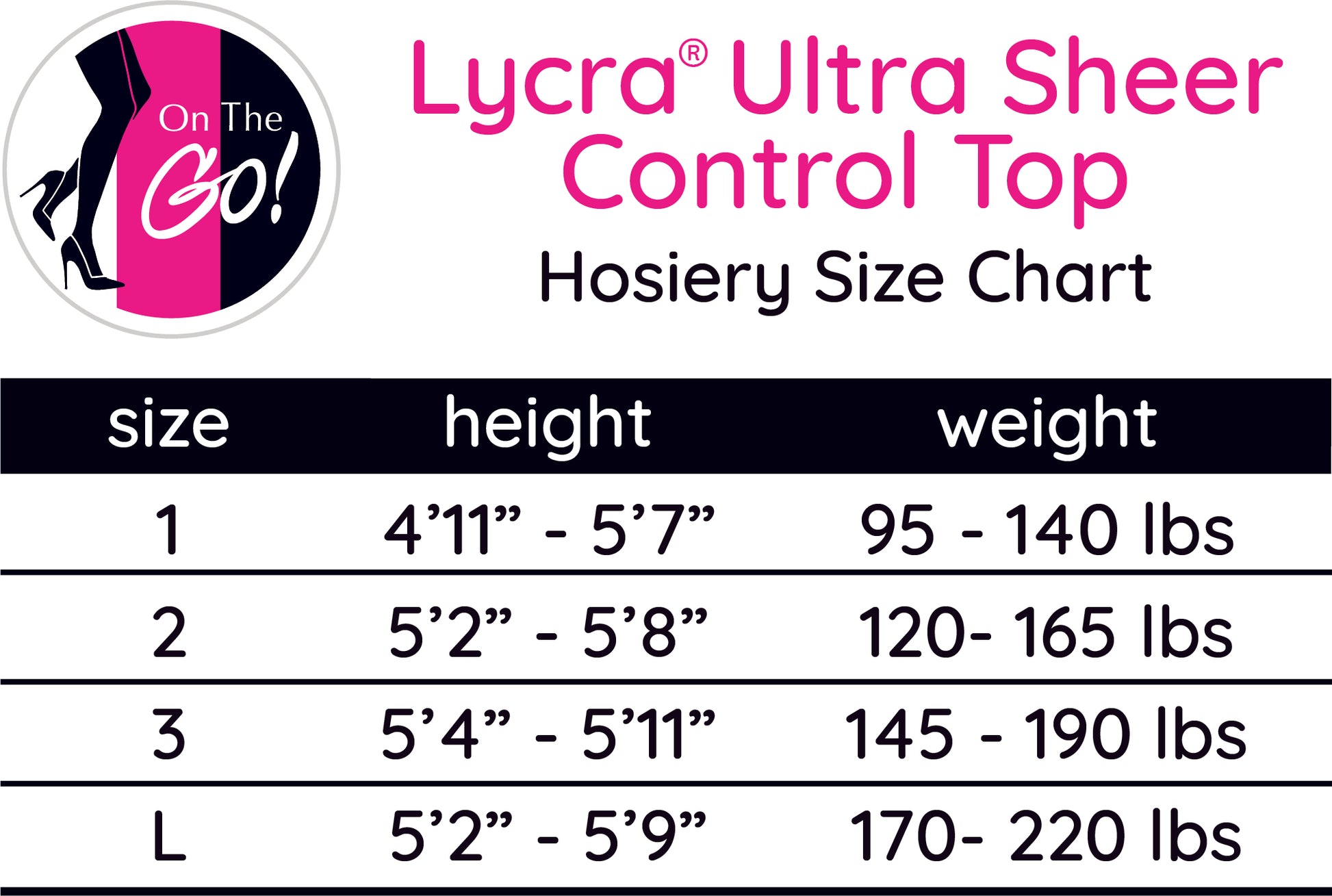 Experience premium comfort and a flawless leg finish with Lycra® Ultra Sheer Control Top Hosiery from On The Go! Hosiery. Crafted with Lycra® fibers for superior stretch and durability, these ultra-sheer pantyhose deliver a natural, barely-there look with a control top that gently smooths your tummy and hips. The soft waistband stays in place without digging in, and the breathable, silky-smooth finish makes them perfect for work, weddings, or everyday wear. Look polished, feel confident—without the weight of traditional shaping tights.
